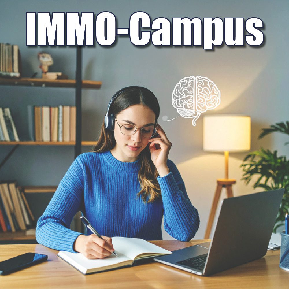Der IMMOcampus ist unser Angebot an angehende Immobilienkaufleute, die sich damit ideal auf ihre Abschlussprüfung vorbereiten können. Neben der Analyse verschiedener Aufgabentypen anhand von Prüfungsaufgaben steht dabei auch Lernen über das Lernen und Gehirntraining im Fokus. Damit geht dieses Angebot weit über das bloße Wiederholen von Lernstoff hinaus und stellt eine ideale Ergänzung bei der Prüfungsvorbereitung dar.
